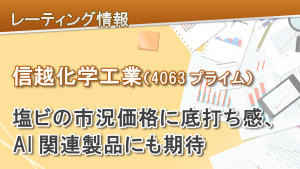 国内個別株(銘柄) 信越化学工業(4063プライム)塩ビの市況価格に底打ち感、AI関連製品にも期待 西平 孝 2026... #塩化ビニル樹脂(1) #AI関連製品(1) #シリコンウェハ(1) #レーティング「強気」(41) レーティング 強気(前回:中立) 目標株価 7,300円(前...